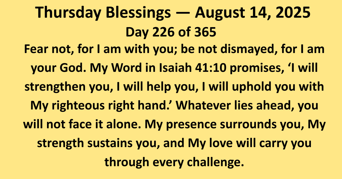 “Fear not, for I am with you; be not dismayed, for I am your God. My Word in Isaiah 41:10 promises, ‘I will strengthen you, I will help you, I will uphold you with My righteous right hand.’ Whatever lies ahead, you will not face it alone. My presence surrounds you, My strength sustains you, and My love will carry you through every challenge.”