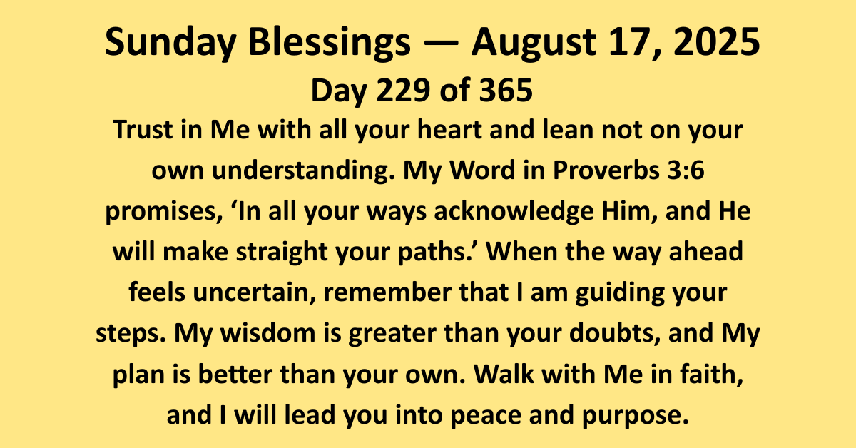 “Trust in Me with all your heart and lean not on your own understanding. My Word in Proverbs 3:6 promises, ‘In all your ways acknowledge Him, and He will make straight your paths.’ When the way ahead feels uncertain, remember that I am guiding your steps. My wisdom is greater than your doubts, and My plan is better than your own. Walk with Me in faith, and I will lead you into peace and purpose.”