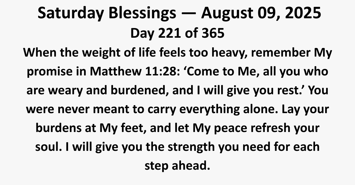 “When the weight of life feels too heavy, remember My promise in Matthew 11:28: ‘Come to Me, all you who are weary and burdened, and I will give you rest.’ You were never meant to carry everything alone. Lay your burdens at My feet, and let My peace refresh your soul. I will give you the strength you need for each step ahead.”