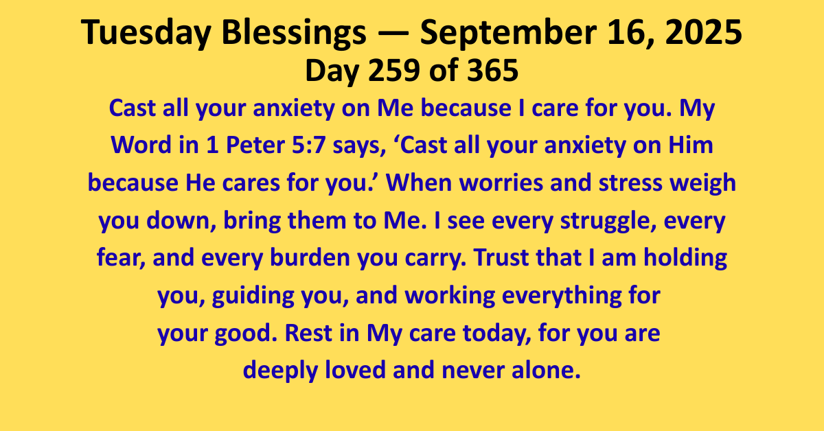 Today, let go of your anxieties. Lay them at God’s feet, trusting that His love is bigger than your worries. Walk in the freedom that comes from knowing you are deeply cared for, and let His peace fill your heart.